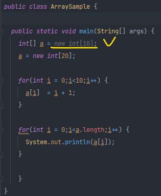 => 배열이 선언되어서, 이미 할당되었는데, a 변수에 새로운 크기의 배열이 저장되었다.