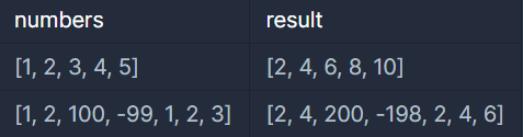 * [1, 2, 100, -99, 1, 2, 3]의 각 원소에 두배를 한 배열 [2, 4, 200, -198, 2, 4, 6]을 return합니다.