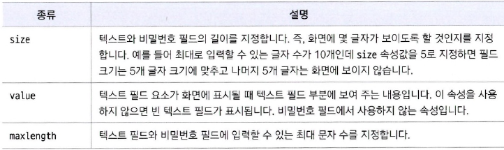 텍스트, 비밀 번호 필드에서 사용하는 주요 속성