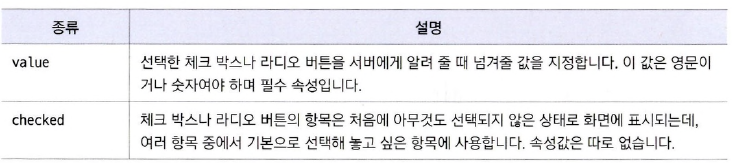- 체크 박스와 라디오 버튼은 여러 항목 중에서 원하는 항목을 선택할 때 사용하는 폼 요소