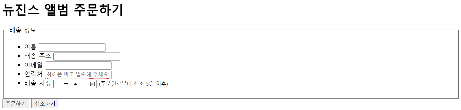 <input type="tel" id="phone" placeholder="하이픈 빼고 입력해 주세요.(01012345678)" required>