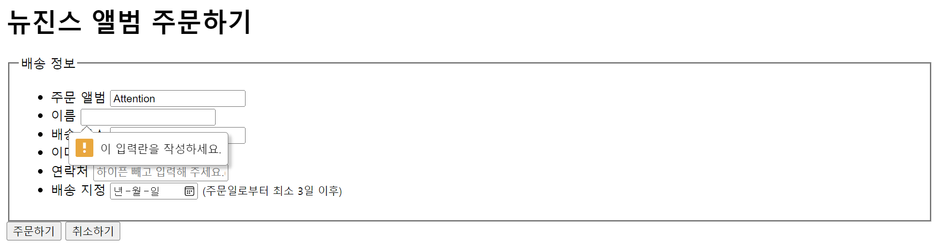 - 반드시 입력해야 하는 내용에는 required 속성을 지정해 필수 필드로 만들 수 있음.