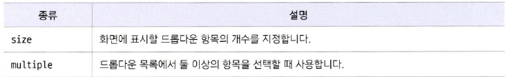 - 이 때 size 속성이나 multiple 속성을 이용하면 드롭다운 목록의 크기나 선택할 항목의 개수를 조절할 수 있음.