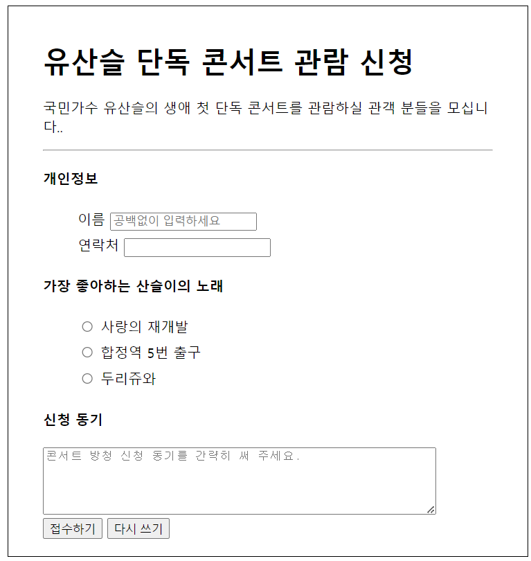 6. 텍스트 영역에 ‘콘서트 방청 신청 동기를 간략히 써 주세요.’ 라는 힌트를 표시합니다.
