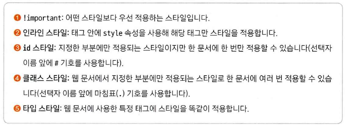 - 케스케이딩 : 우선순위가 있어서 웹 요소에 둘 이상의 스타일을 적용할 때 우선순위에 따라 적용할 스타일을 결