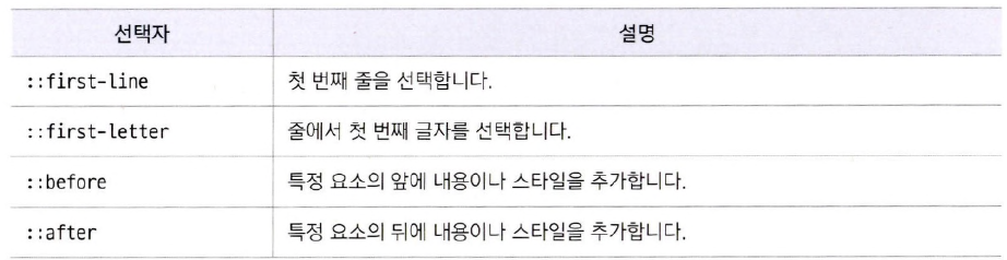 - ::first-line 요소와 ::first-letter 요소를 사용하면 지정한 요소의 첫 번째 줄이나 첫 번째 글자에 스타일을 적용
