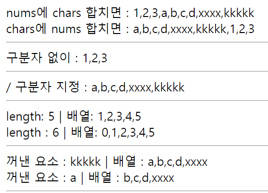 document.write("nums에 chars 합치면 : ", numChars, "<br> chars에 nums 합치면 : ", charNums);