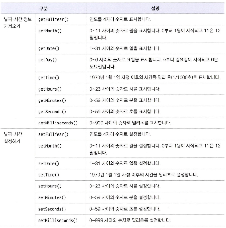 - 내장 객체: 웹 프로그래밍을 할 때 자주 사용하는 요소는 자바스크립트 안에 미리 객체로 정의되어 있다., 예를 들어 날짜, 시간과 관련된 프로그램을 개발하려면 Date 객체를 가져와 쉽게 사용할 수 있다.