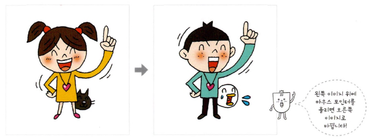 - 이미지 위로 마우스 포인터를 올려놓으면 다른 이미지로 바뀌었다가