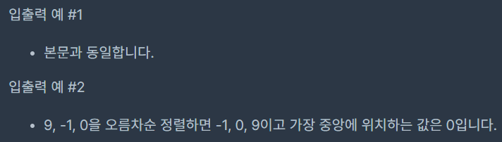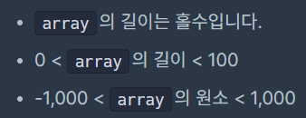 정수 배열 array가 매개변수로 주어질 때, 중앙값을 return 하도록 solution 함수를 완성해보세요.