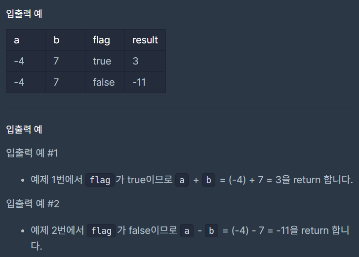 flag가 true면 a + b를 false면 a - b를 return 하는 solution 함수를 작성해 주세요.
