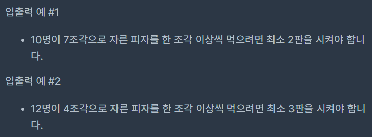 • 몫을 구한다음에 적어도 몫 만큼의 피자가 필요하다는 것을 알게 되고, 나머지가 있으면 +1 을 해줘야 한다는 소리