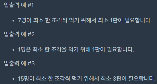 모든 사람이 피자를 한 조각 이상 먹기 위해 필요한 피자의 수를 return 하는 solution 함수를 완성해보세요.
