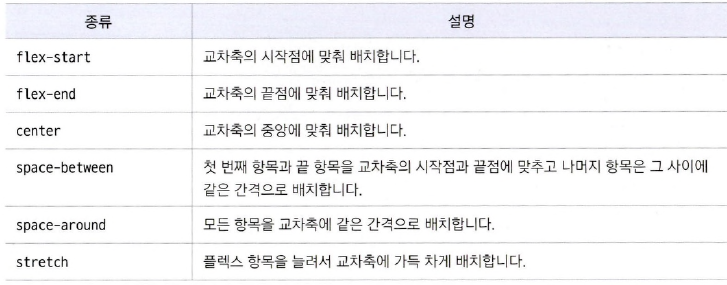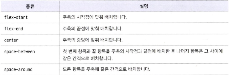 - 주축에서 플렉스 항목 간의 정렬 방법을 지정