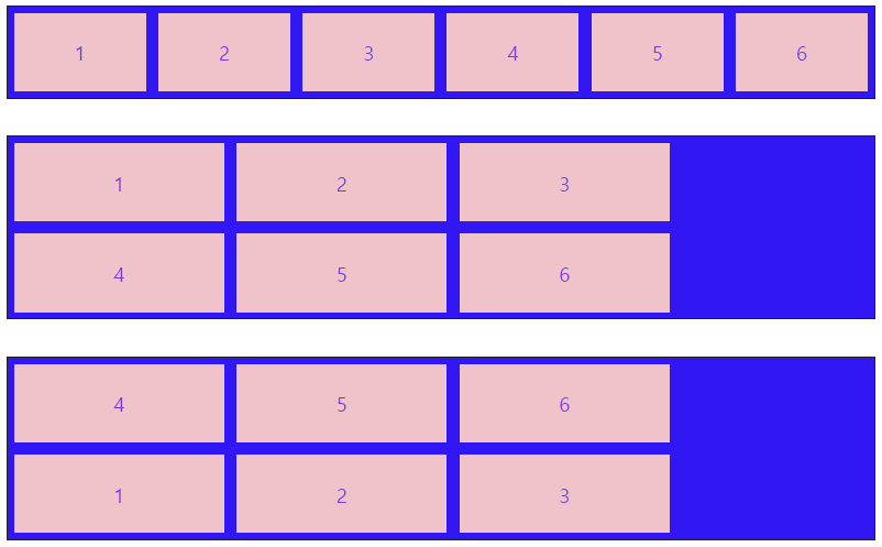 - 속성값으로 wrap이나 wrap-reverse로 지정한 후 웹 브라우저 화면의 너비를 늘리거나 줄여보면 플렉스 컨테이너의 너비에 따라 여러 줄로 표시됨.
