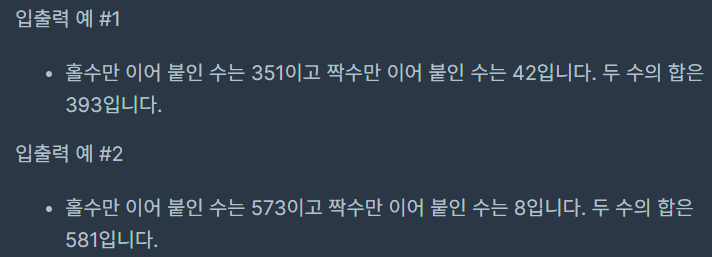 num_list의 홀수만 순서대로 이어 붙인 수와 짝수만 순서대로 이어 붙인 수의 합을 return하도록 solution 함수를 완성해주세요.