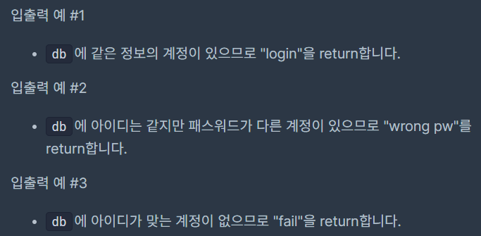 다음과 같이 로그인 성공, 실패에 따른 메시지를 return하도록 solution 함수를 완성해주세요.