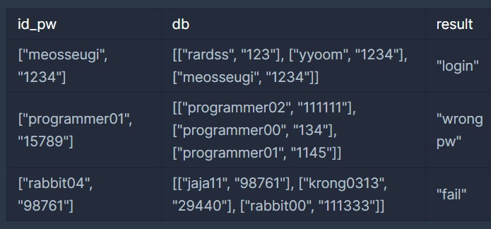 머쓱이가 입력한 아이디와 패스워드가 담긴 배열 id_pw와 회원들의 정보가 담긴 2차원 배열 db가 주어질 때,
