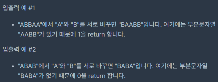 myString의 "A"를 "B"로, "B"를 "A"로 바꾼 문자열의 연속하는 부분 문자열 중