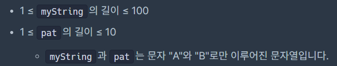 문자 "A"와 "B"로 이루어진 문자열 myString과 pat가 주어집니다.
