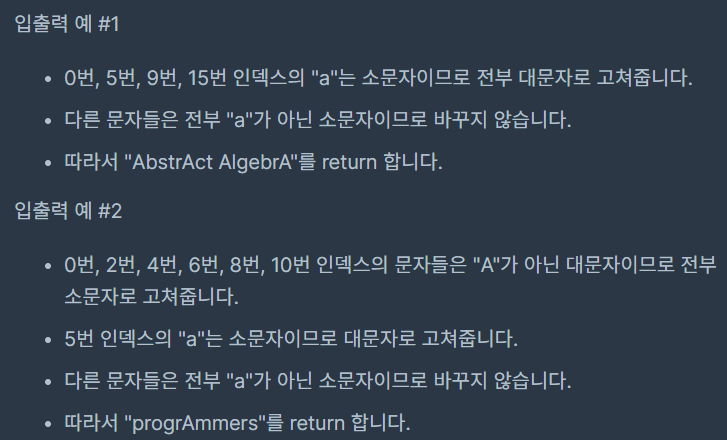 - 조건 분기를 a인 경우 대문자화 / A가 아닌 경우 전부 소문자화 / 둘 다 해당 안 하는 경우 새 문자열에 그대로 더하기
