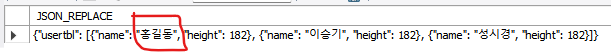 SELECT JSON_REPLACE(@json , '$.usertbl[0].name', '홍길동') AS JSON_REPLACE;