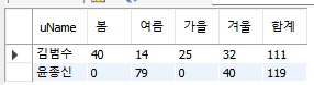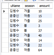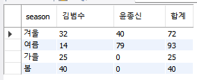 ('김범수', '여름', 14), ('김범수', '겨울', 22), ('윤종신', '여름', 64);