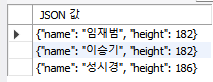 SELECT JSON_OBJECT('name', name, 'height', height) AS 'JSON 값'