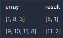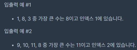 - 배열을 리턴하라고 했는데, 거기에 원소로 가장 큰 수와 그 수의 인덱스를 담으라고 했다. 그럼 자연스레 배열 크기는 2칸임을 추론할 수 있음.