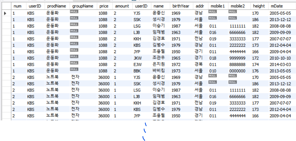 <문제> 회원 테이블과 구매 테이블의 모든 행을 조인시키기