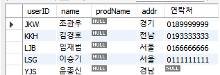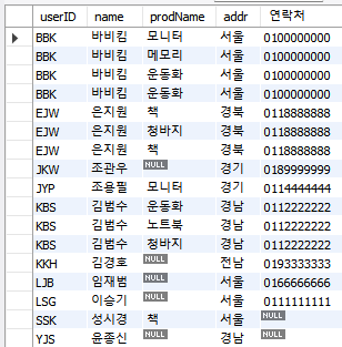 SELECT u.userID, u.name, b.prodName, u.addr, CONCAT(u.mobile1, u.mobile2) AS '연락처'