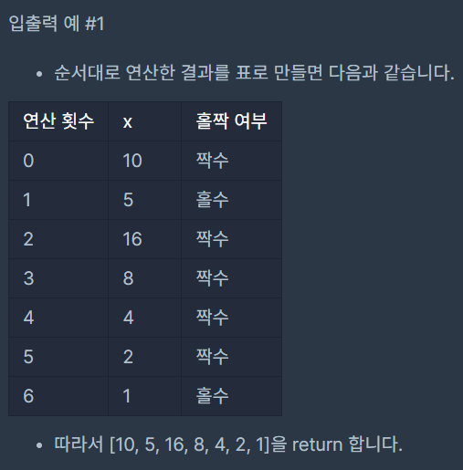 임의의 1,000 보다 작거나 같은 양의 정수 n이 주어질 때 초기값이 n인 콜라츠 수열을 return 하는 solution 함수를 완성해 주세요.
