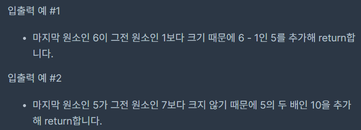 정수 리스트 num_list가 주어질 때, 마지막 원소가 그전 원소보다 크면 마지막 원소에서 그전 원소를 뺀 값을 마지막 원소가 그전 원소보다 크지 않다면 마지막 원소를 두 배한 값을 추가하여 return하도록 solution 함수를 완성해주세요.
