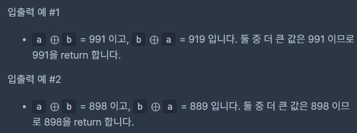 양의 정수 a와 b가 주어졌을 때, a ⊕ b와 b ⊕ a 중 더 큰 값을 return 하는 solution 함수를 완성해 주세요.