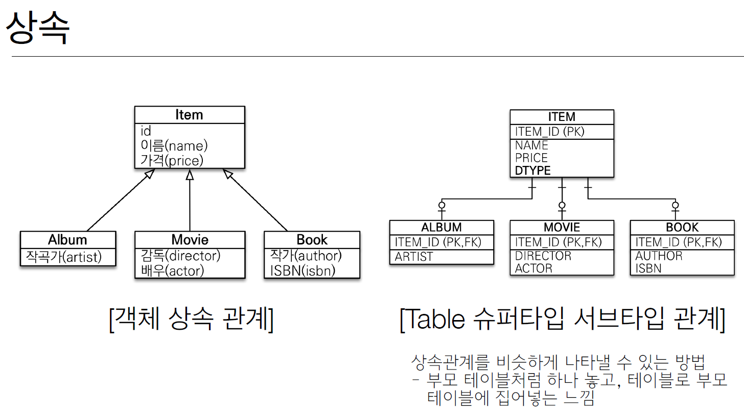 * 데이터베이스 테이블에는 명확하게 상속관계를 저장할 방법이 없다.
