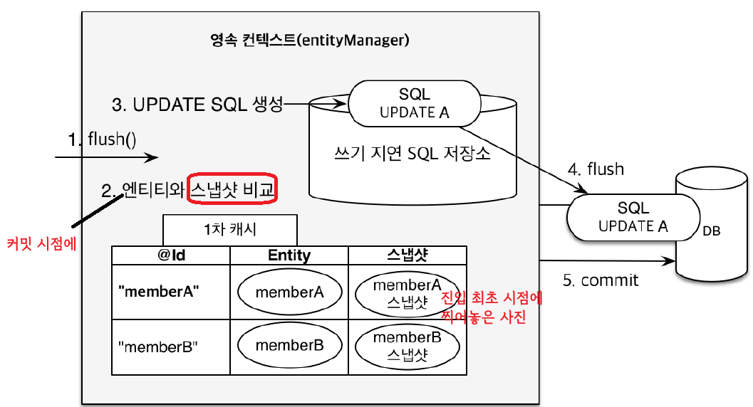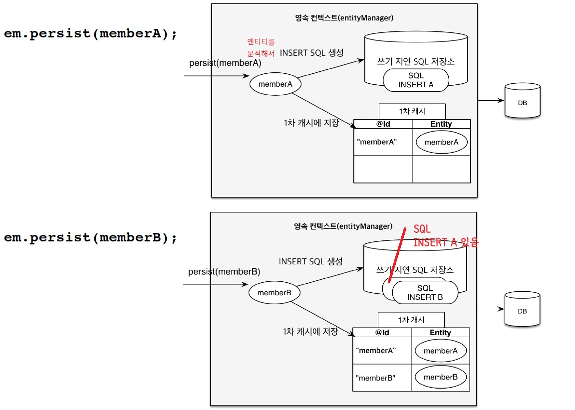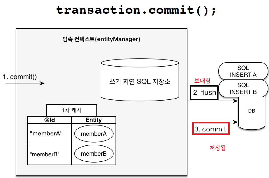 그러나, 영속 상태가 되었다고 해서(em.persist(member)) 반드시 데이터베이스에 저장되었다고 할 수는 없다