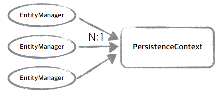 J2EE 환경, 스프링 프레임워크 같은 컨테이너 환경 : 엔티티 매니저와 영속성 컨텍스트가 N : 1