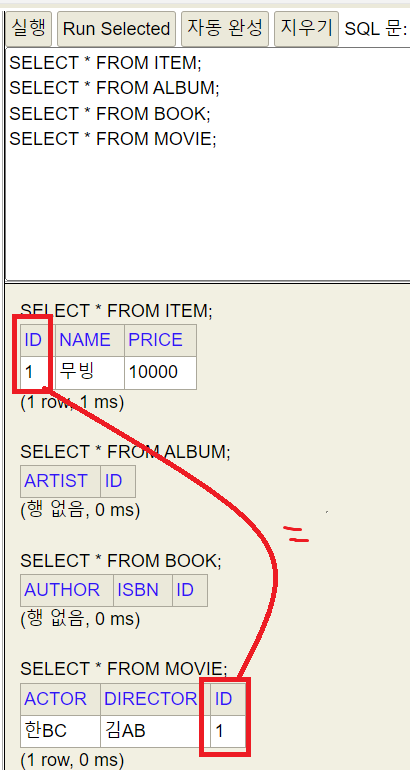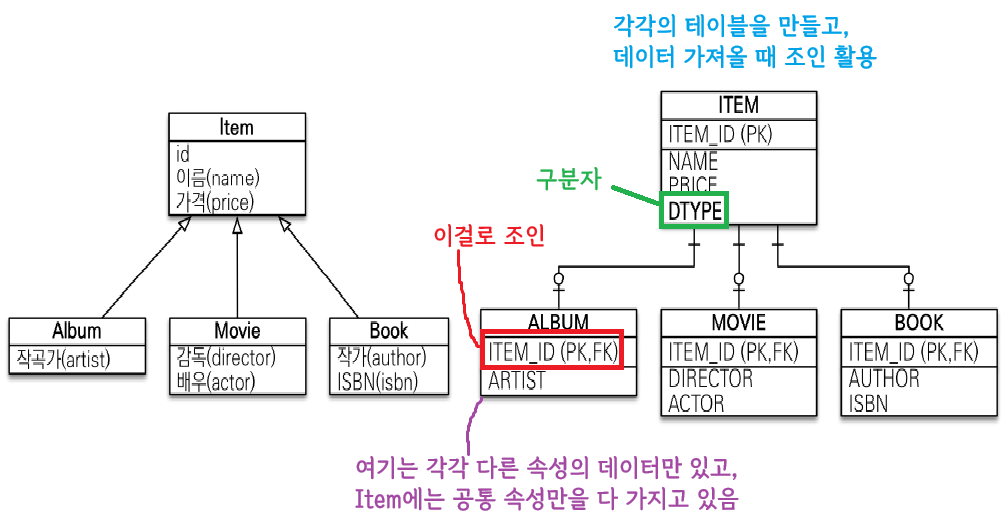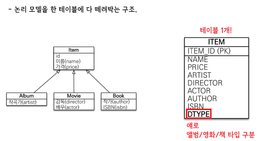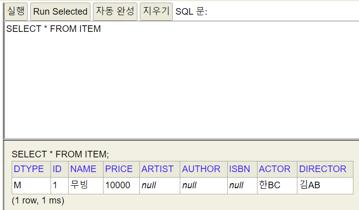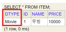 얘는 한 테이블에 다 때려박기 때문에 JPA가 구분을 위해 DTYPE을 넣어준다 필수 로.