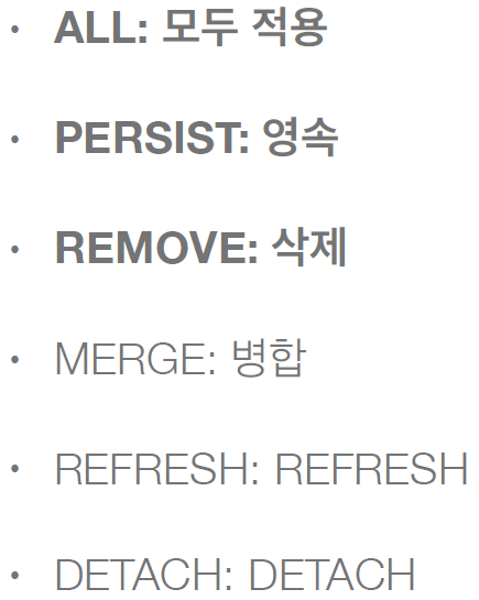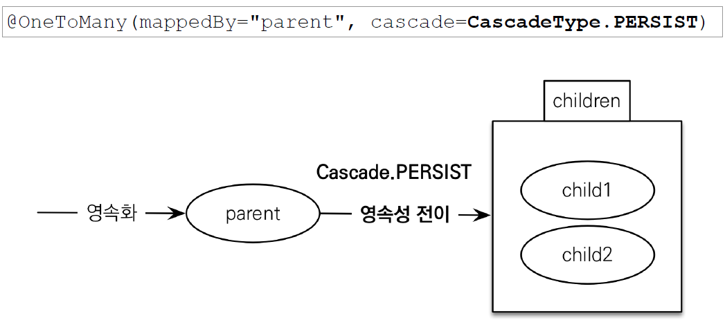 Parent를 persist() 할 때, 얘 밑에 있는 애들도 같이 persist() 를 날려줄거야 하는 게 CASCADE