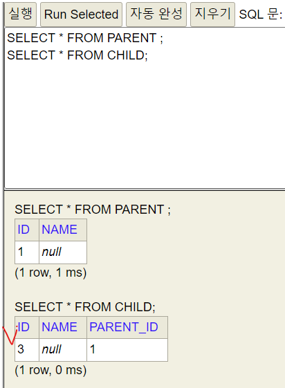 중요한 것은 Parent는 JPA를 통해서 생명주기를 관리 중이다.