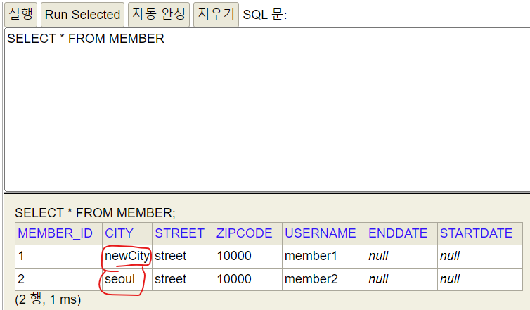 member1과 member2 가 둘 다 같은 주소를 들고 있다.