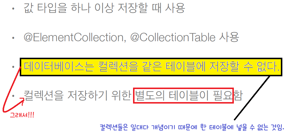 - 값 타입을 컬렉션에 담아서 쓰는 것