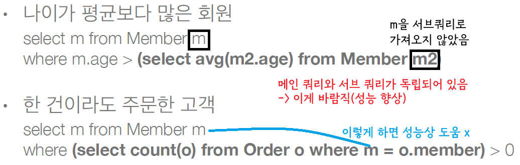 String query = "select (select avg(m1.age) from Member m1) as avgAge from Member m join Team t on m.username = t.name";