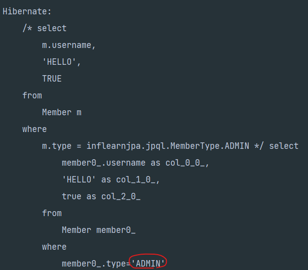+ "where m.type = inflearnjpa.jpql.MemberType.ADMIN";