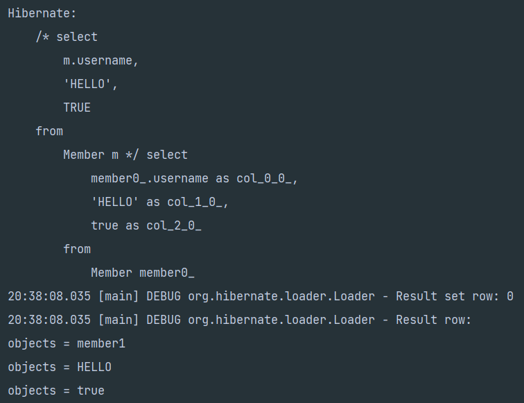 String query = "select m.username, 'HELLO', TRUE from Member m "