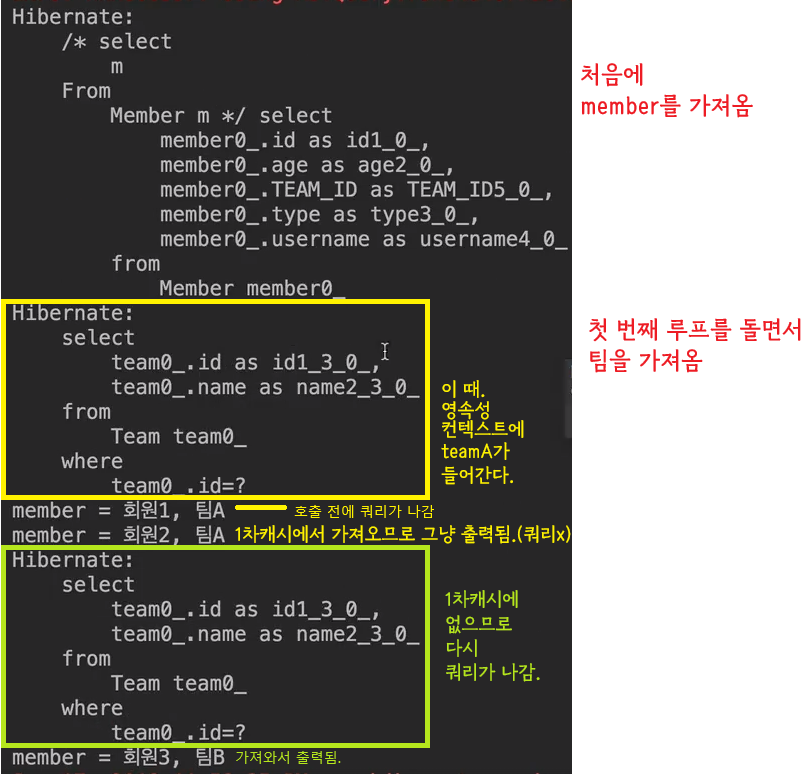 그러면 팀은 프록시로 들어온다. 지연 로딩이 일어나고, 실제 member.getTeam().getName()을 호출한 시점에 그때마다 데이터베이스에 쿼리를 날린다.