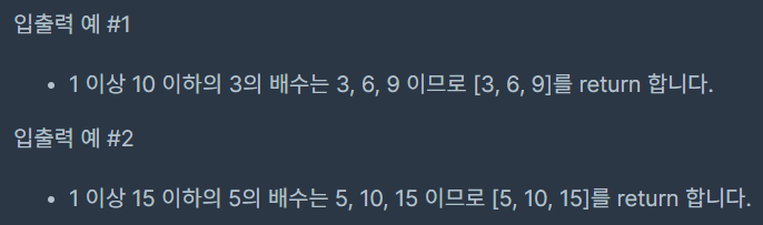 정수 n과 k가 주어졌을 때, 1 이상 n이하의 정수 중에서 k의 배수를 오름차순으로 저장한 배열을 return 하는 solution 함수를 완성해 주세요.