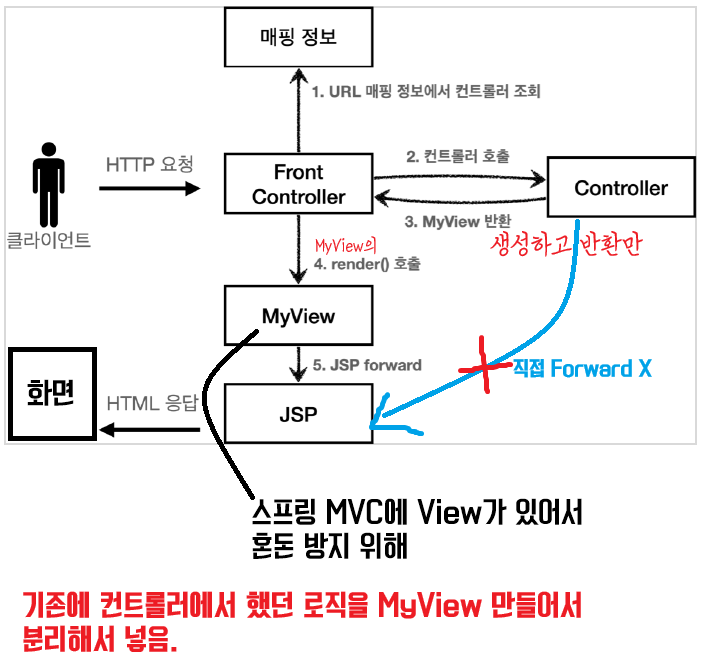 - ControllerV2에서는 뷰 페이지의 경로 등을 직접 처리하는 것이 아니라, MyView 객체를 반환