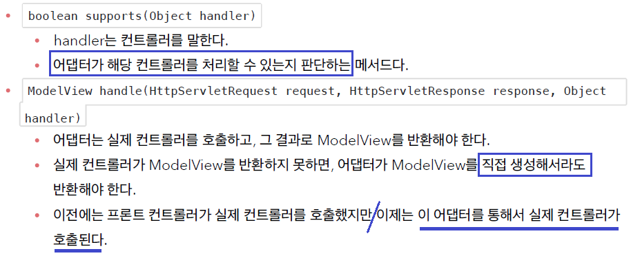 - 이 컨트롤러 어댑터는 ControllerV3 타입의 컨트롤러를 처리하기 위한 어댑터로, 해당 컨트롤러를 실행하고 모델 뷰를 반환하는 역할