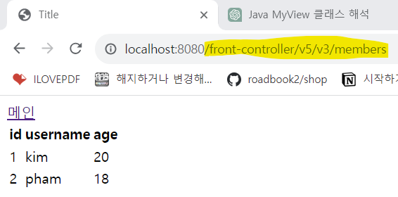 목록: http://localhost:8080/front-controller/v5/v3/members